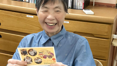 利用者同士で、色の配置や向きなど相談されながら、取り組み、完成した作品を手に取られ、「きれいでー」と満足げな表情でした。そして、普段あまり話をされない方の元に行き、作品を見せ合い、お互いの良いところを話され、会話や笑顔が増えました。