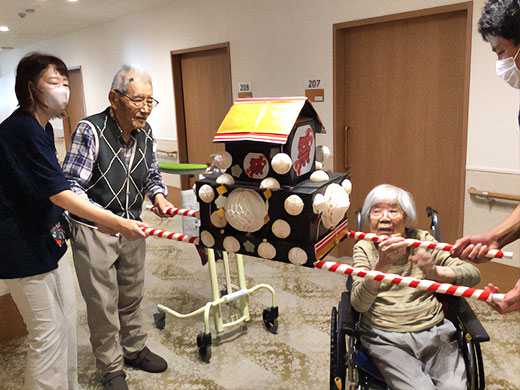 職員手作りのおみこしをお囃子の音楽に合わせ「わっしょい!わっしょい!」と元気な掛け声で担ぎながら各フロアを回り、会場は大きな拍手と笑顔に包まれました。