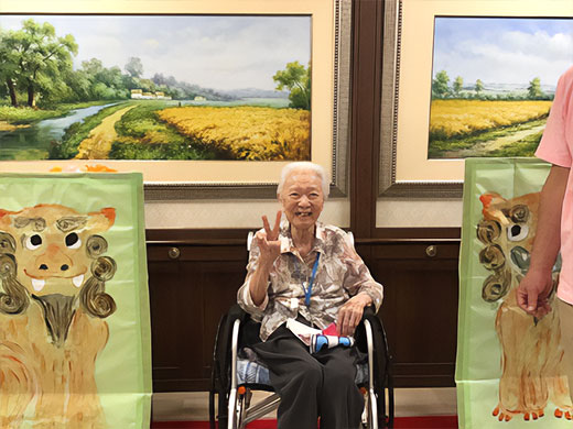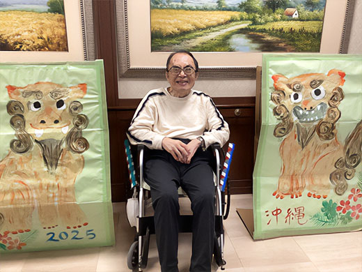 職員が丹精込めて描いた、沖縄の守り神として親しまれているシーサーのパネルを使ったフォトスポットです。大きな口を開けたシーサーの隣で、ご入居者様は思い思いに写真撮影を楽しまれていました。