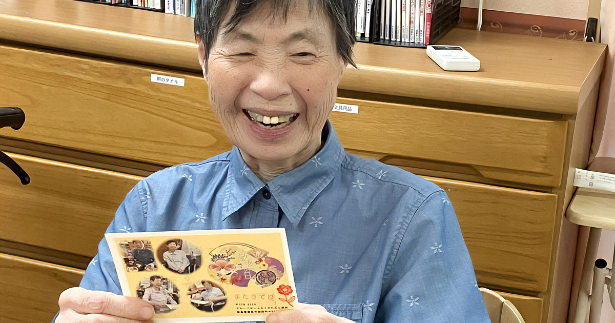 イベントに参加された際の写真を印刷し、ご利用者様にメッセージを書いていただいたり、記入が難しい方には、伝えたい言葉をお伺いして文字スタンプで代筆しました。ご利用者様は「返事をくれるかなぁ」とお話しされたり、ご家族様との思い出をお聞かせくださったりしました。