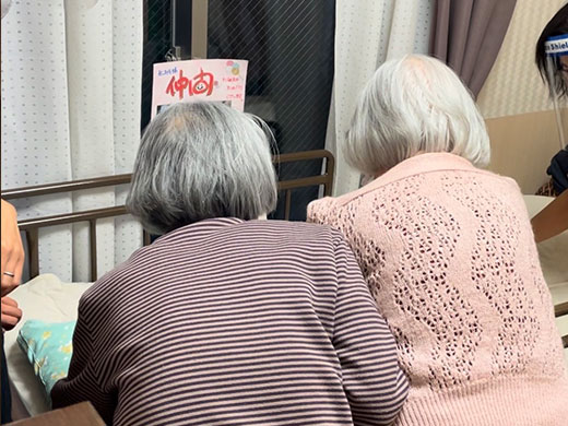 職員は、他の入居者を誘い、居室へお見舞いをする。