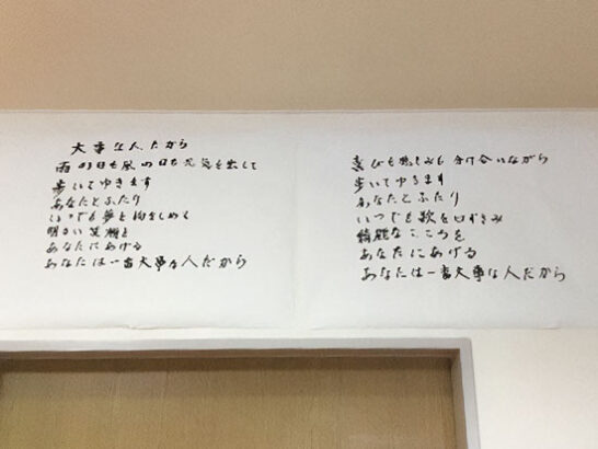 現在、皆様の一番のお気に入りの歌は、昔むかしの演歌です。歌詞を大きく書いてくださり、ホールの壁に掲示しました。それを見ながら毎日歌っておられます。